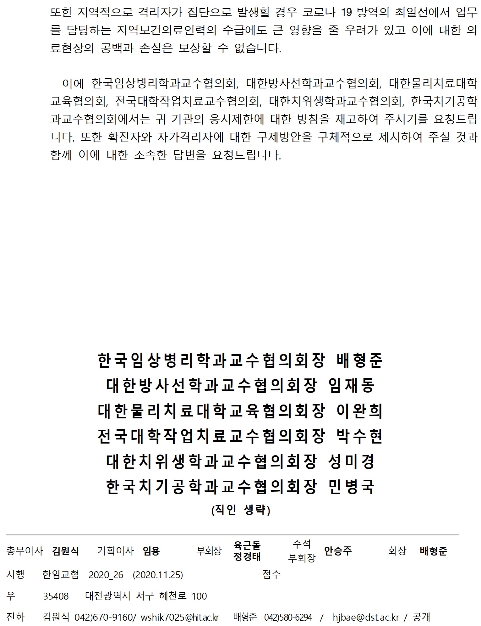 한국보건의료인국가시험원의 응시자 유의사항에 의하면 ‘(응시제한 등) 코로나19 확산방지를 위하여 확진환자, 의사환자 및 감염병 의심자 등 방역당국으로부터 입원치료통지서(또는 자가격리통지서)를 받아 격리중인 자는 시험에 응시할 수 없으며, 시험장 출입을 금합니다.’라고 되어 있습니다. 이는 대학수학능력평가, 중등교사임용후보자 선정시험 등과 형평성에 맞지 않는 것입니다. 이에 대해, 대물대교협을 포함한 "한국임상병리학과교수협의회, 대한방사선학과교수협의회, 대한물리치료대학교육협의회, 전국대학작업치료교수협의회, 대한치위생학과교수협의회, 한국치기공학과교수협의회"는 한국보건의료인국가시험원에 여러 차례 유.무선을 통해 재고해 줄 것과 미응시한 확진자 또는 자가격리자에 대한 추후 구제방안에 대하여 질의를 하였으나 유의사항에 대한 변경은 없다는 답변과 함께 구체적인 구제방안도 제시받지 못하고 있습니다. 이에 대해, 답변서 요청을 공문으로 접수하는 등에 노력을 지속하고 있습니다. 우리 학생들이 평등한 권리를 보장받을 수 있도록 적극 홍보를 부탁드립니다.