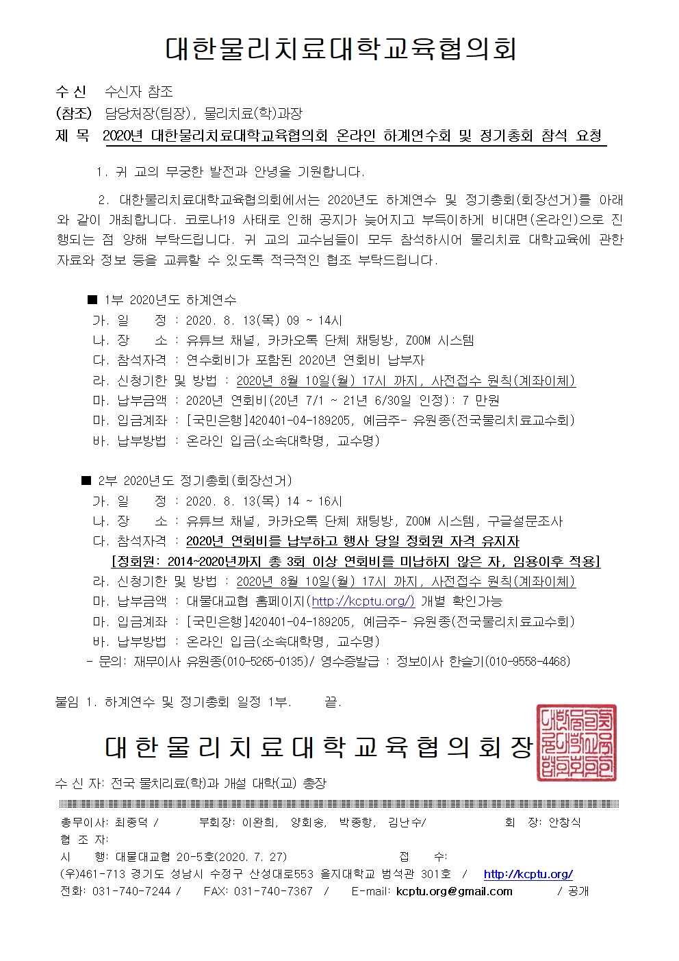 2020년 대한물리치료대학교육협의회 하계연수 및 정기총회 안내