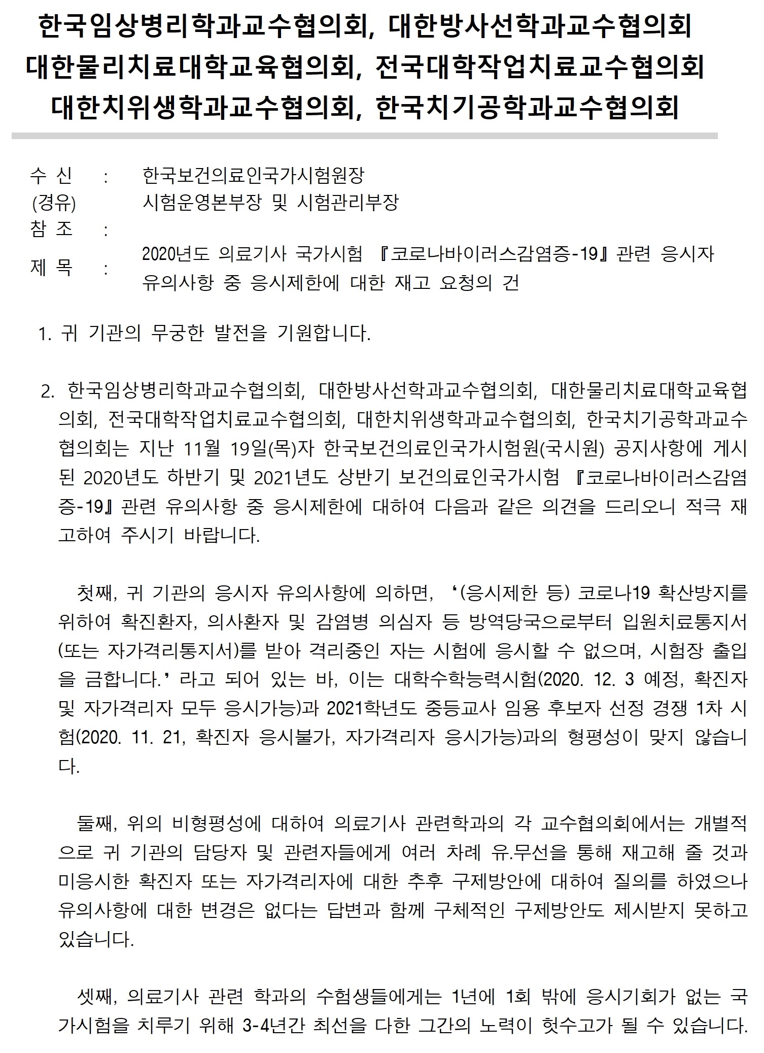 한국보건의료인국가시험원의 응시자 유의사항에 의하면 ‘(응시제한 등) 코로나19 확산방지를 위하여 확진환자, 의사환자 및 감염병 의심자 등 방역당국으로부터 입원치료통지서(또는 자가격리통지서)를 받아 격리중인 자는 시험에 응시할 수 없으며, 시험장 출입을 금합니다.’라고 되어 있습니다. 이는 대학수학능력평가, 중등교사임용후보자 선정시험 등과 형평성에 맞지 않는 것입니다. 이에 대해, 대물대교협을 포함한 "한국임상병리학과교수협의회, 대한방사선학과교수협의회, 대한물리치료대학교육협의회, 전국대학작업치료교수협의회, 대한치위생학과교수협의회, 한국치기공학과교수협의회"는 한국보건의료인국가시험원에 여러 차례 유.무선을 통해 재고해 줄 것과 미응시한 확진자 또는 자가격리자에 대한 추후 구제방안에 대하여 질의를 하였으나 유의사항에 대한 변경은 없다는 답변과 함께 구체적인 구제방안도 제시받지 못하고 있습니다. 이에 대해, 답변서 요청을 공문으로 접수하는 등에 노력을 지속하고 있습니다. 우리 학생들이 평등한 권리를 보장받을 수 있도록 적극 홍보를 부탁드립니다.